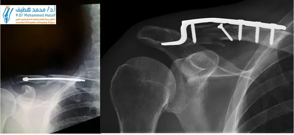 قد تكون الجراحة مطلوبة حالكان كسر عظمة الترقوة قد اخترق فيها الجلد أو بها إزاحة شديدة أو الكسر موجودًا في عدة أجزاء. وعادة ما تتضمن جراحة الترقوة المكسورة وضع أجهزة تثبيت — شرائح أو مسامير أو قضبان — للحفاظ على الوضع الصحيح للعظام أثناء التئامها. يمكن أن تشمل المضاعفات الجراحية، على الرغم من ندرتها، العدوى وعدم التئام العظام.