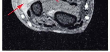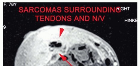 FIG 5 • Recurrent high-grade sarcoma of the distal forearm. The recurrent disease is diffused and wide resection would result in loss of neurovascular structures and all flexor tendons and would end with an extensive soft tissue defect in a previously irradiated surgical field. Below-elbow amputation was, therefore, done (planned incision is outlined). Major vascular involvement. The neurovascular bundle within the arm is tightly integrated in a closed anatomic space. The cephalic vein usually provides sufficient collateral flow if the brachial or the axillary vein has to be sacrificed. However, although occasionally the tumor mass can be delicately dissected off the brachial artery, in most cases of vascular involvement, the brachial artery is extensively encased and amputation is inevitable (FIG 6). The compact nature of the vascular supply to the wrist makes involvement of the radial and ulnar arteries likely when a large tumor invades the volar aspect of the distal forearm. In this instance, the incidence of morbidity and failure associated with resection and reconstruction using a vascular graft of one of these vessels is prohibitively high.Major nerve involvement. In general, one nerve around the arm can be sacrificed and a two-nerve deficit is tolerated. Sacrifice of the three major nerves leaves the patient with a functionless extremity that is better off amputated. Nerve grafting for replacement of a section of the median, radial, or ulnar nerves is still not associated with satisfactory function. FIG 6 • MRI demonstrating tendon and neurovascular involvement, a true indication for amputation.