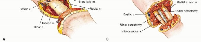 TECH FIG 2 • Osteotomies are performed at the appropriate location, as determined by the preoperative imaging studies: (A) above-elbow amputation and (B) below-elbow amputation. For above-elbow amputation, the osteotomy is done at the distal third of the humerus; for below-elbow amputation, the radius and ulna are transected at equal lengths at the appropriate level.