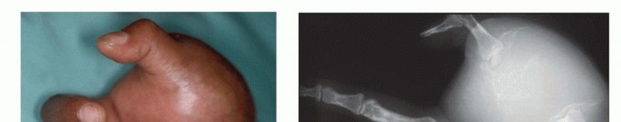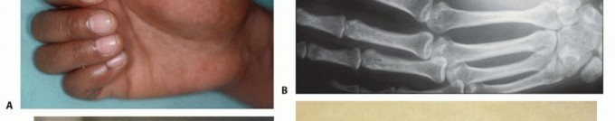 FIG 3 • A. Clinical picture and (B) plain radiograph showing high-grade sarcoma of the first metacarpus. C. Fungating soft tissue sarcoma of the hand. D. Extensive necrotic and fungating sarcoma of the wrist. These tumors necessitate below-elbow amputation to achieve local tumor control.