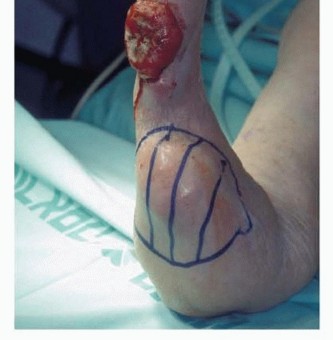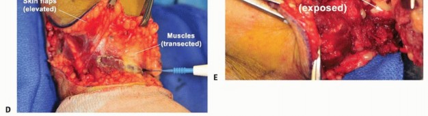 TECH FIG 1 • A. Anterior/posterior fish-mouth flaps are used. B. The skin and superficial fascia are divided perpendicular to the skin surface. C-E. Intraoperative photographs representing the flap development and