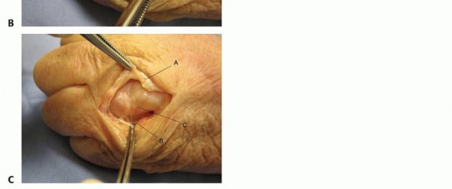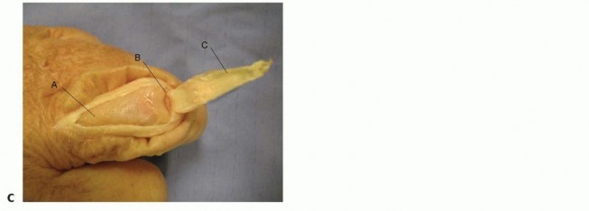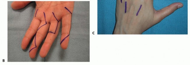 TECH FIG 1 • Examples of volar (A,B) and dorsal (C) incisions for the hand and digits.