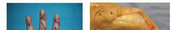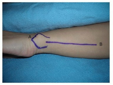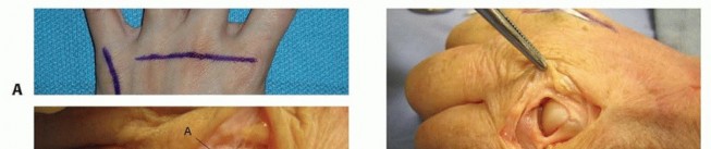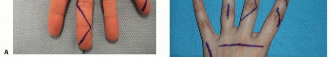 Incisions perpendicular to a volar flexion crease should be avoided to prevent scar formation and secondary skin contractures that can lead to loss of motion and functional impairment ( TECH FIG 1A,B).