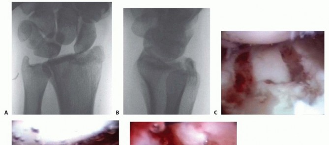 Patients with severe loss of cartilage of the carpus should be considered for salvage procedures such as total wrist arthrodesis or arthroplasty.Although results are early, del Piñal et al 8 demonstrated that good pain relief and return of motion could be obtained by resecting the fragments and creating a smoother joint surface. This could provide a temporarytreatment for active patients and possibly a definitive treatment for low-demand patients. 8Diagnostic arthroscopy is first performed. Evaluation of the midcarpus must be performed to exclude pathology at this site.Typically, there is significant amount of debris and synovitis that must be débrided with a shaver to visualize the radiocarpal joint.A burr is then placed in the radiocarpal joint to smooth the raised malunited cancellous surface of the radius to a level slightly below the normal cartilaginous surface.The injured area of carpus is then likewise débrided with a shaver to obtain a smooth surface.Patients are started on range-of-motion exercises immediately unless excluded by other concomitant procedures.PEARLS AND PITFALLS