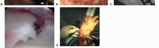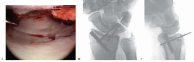 All radiographic studies are reviewed.Equipment needed for arthroscopic treatment and for open stabilization is made available.Small joint instrumentation is essential for arthroscopic-assisted fixation of distal radius fractures. The small jointP.265arthroscope is approximately 2.7 mm in diameter, and even smaller scopes may be used if desired. In addition, a small joint shaver (3.5 mm or less) is useful to clear fracture debris and hematoma.The ideal timing for arthroscopic-assisted fixation of distal radius fractures is 3 to 10 days following injury. 13Earlier attempts at fixation may be complicated by soft tissue swelling and troublesome bleeding, obscuring visualization.After 10 days, the fracture fragments start to become sticky and more difficult to percutaneously elevate and reduce.