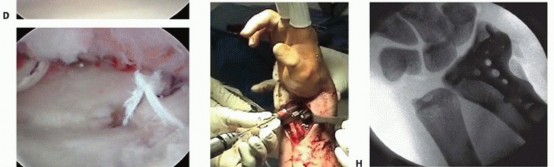 TECH FIG 2 •(continued)G,H. PA and lateral radiographs showing anatomic reduction to the impacted scaphoid facet fracture. (The tear of the SLIL also was acutely repaired.)