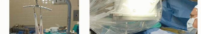 Arthroscopic-assisted fixation of distal radius fractures may be performed with the arm suspended vertically in a traction tower, horizontally in a traction tower, or with finger traps applied attached to weights hanging over the edge of the hand table.Wrist arthroscopy in the horizontal position may make it easier to simultaneously monitor the reduction fluoroscopically and place hardware. However, it does not allow for simultaneous volar access to the wrist.Suspending the wrist in a vertical position with a traction tower allows simultaneous access to both the volar and dorsal aspects of the wrist. This is particularly useful when wrist arthroscopy is used as an adjunct to volar plate fixation of the distal radius fracture.A new traction tower has been designed to allow simultaneous evaluation of the intra-articular reduction of the distal radius arthroscopically and fluoroscopically ( FIG 2A).The surgeon may stabilize a comminuted fracture of the distal radius with a plate, and simultaneously evaluate the articular reduction arthroscopically.The traction tower allows for traction of the wrist in either the vertical or horizontal planes, depending on the surgeon's preference ( FIG 2B).
