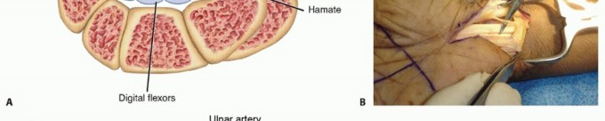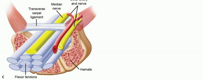 FIG 1 • A. Cross-section of the carpal tunnel. B. The carpal tunnel has been fully released, and the median nerve motor branch is seen branching from the nerve proximally and penetrating the radial portion of the TCL. C. Cross-section of the carpal tunnel with the ulnar artery and nerve superficial to the TCL.(continued)