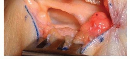 When revision CTR reveals median nerve scarring, surgical tactics to improve the environment aroundthe nerve after the neurolysis to reduce rescarring are attractive. Strickland et al15 has described this technique in several publications. The tissue is readily available and has been shown to be of benefit. Ina 1996 article,15 62 patients were reviewed. Results were good based on pre- and postoperative patient satisfaction scores, with only three transient minor complications.Dissect the fat pad to the level of the ulnar nerve and artery, and advance the radial edge to cover the median nerve.Sew this edge to the radial flap of the TCL.