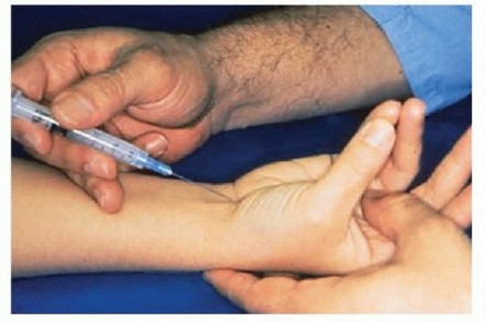 Wrist splints can be introduced.The physician can recommend or prescribe nonsteroidal anti-inflammatory drugs (NSAIDs). Corticosteroid injection into the carpal canal can be considered (FIG 2).Temporary relief from such an injection indicates that surgical decompression is likely to be successful.Hand therapy can be considered.Evidence suggests oral vitamin B12 or B6 treatments can be helpful.17,18