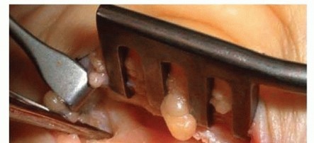 TECH FIG 2 • Open CTR with divided leaflets of the TCL retracted by the retractor jaws. The instrument is on the median nerve which is adherent to the undersurface of the TCL via tenosynovium. In primary CTR procedures without systemic disease, there is no role for internal neurolysis or tenosynovectomy (TECH FIG 2).4,9,12The wound is closed and sterile dressings are applied. My preference is interrupted 4-0 Prolene or nylon sutures.Use of a splint is based on the surgeon's preference.1. Single-Incision Endoscopic Carpal Tunnel Release (Modified Agee Technique)