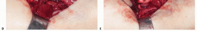 FIG 1 •(continued)D. Traction on the median nerve secondary to significant displacement of a distal radius and ulna fracture. The nerve was displaced dorsal to the radius and ulna and remained dorsal following reduction. E. The nerve is shown after being removed from between the radius and ulna. (B: Copyright Thomas R. Hunt III, MD.)