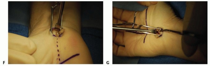 TECH FIG 1 •(continued)F. A right angle retractor is used to visualize the proximal TCL and the distal forearm fascia. G. The same retractor is then used to visualize the distal TCL to allow complete release. (B-G: Copyright Thomas R. Hunt, III, MD.)