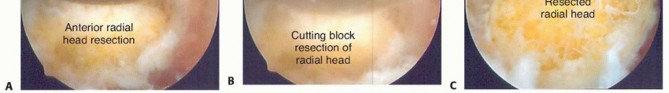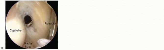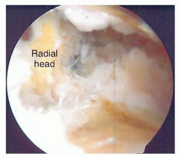 TECH FIG 6 • The posterior radiocapitellar joint can be visualized by advancing the arthroscope down the posterolateral gutter.1.Open SynovectomyLateral approach to the elbowThe arm is elevated and exsanguinated and a pneumatic tourniquet inflated.A 12-cm curvilinear incision is made on the lateral aspect of the elbow centered over the radiocapitellar joint. Dissection is carried sharply with scalpel down to the fascia, and fullthickness skin flaps are raised both anterior and posterior.The extended Kocher approach is typically used.10 A fatty stripe can be visualized that defines the interval between the anconeus and extensor carpi ulnaris (ECU). The fascia over the fatty stripe is incised, and blunt dissection with an elevator lifts the ECU anteriorly and anconeus posteriorly to expose the joint capsule. Keep the forearm pronated to protect the PIN.Alternatively, the lateral approach to the elbow can be used by developing the interval between the extensor digitorum communis (EDC) and the extensor carpi radialis longus (ECRL) or by splitting the EDC tendon. Through the lateral approach, the PIN is at risk of injury.The capsule and LCL complex should be in view.Make capsulotomy to access the elbow joint.Incise the capsule anterior to the equator of the radiocapitellar joint in line with the radius.Capsular incision should be made anterior to the lateral ulnar collateral ligament (LUCL) to avoid PLRI. The capsulotomy will go through a portion of the radial collateral ligament (RCL), which can be repaired at the completion of the case.Extend exposure with release of the LCL complex.With the LCL clearly identified, sharp release of the LCL off of the lateral epicondyle of the humerus allows the elbow joint to “book open” while preserving the integrity of the ligament.This provides excellent exposure to the anterior capsule and anterior compartment.The LCL complex can be repaired at the completion of the case through drill holes in the lateral epicondyle or with use of a double-loaded suture anchor.Incise annular ligament.The annular ligament can be incised in line with the radius and tagged for later repair.Take great caution in exposure distal to the annular ligament, as the PIN is at risk of injury. If dissection must be carried distal to the annular ligament, the PIN must first be identified and protected.Resect or keep radial head.At this stage, a radial head resection can be performed if indicated.Place small Hohmann retractors around the radial neck to protect the PIN and resect the radial head with a microsagittal saw.If the radial head is preserved, the anterior capsule can be exposed anterior to the radiocapitellar joint.Perform anterior synovectomy.Retractors can be placed into the elbow joint so the anterior musculature can be retracted anteriorly. The synovium can be excised with a rongeur, leaving the anterior capsule intact.If using electrocautery, take great care not to damage the articular cartilage. The medial recess cannot be accessed through this exposure.Extend exposure proximally to gain access to posterior compartment.Proximally, the interval between the triceps and ECRL can be defined. The triceps is retracted posterior and ECRL retracted anterior to gain access to the posterior compartment.A retractor can be placed deep to the triceps to access the posterior compartment.A synovectomy of the posterior compartment and the olecranon fossa can be performed.Expose the ulnar nerve if necessary.If indicated, the ulnar nerve can be exposed through a medial approach. Once the ulnar nerve is identified and protected, the posteromedial gutter can be exposed to complete the posterior synovectomy.ClosureThe LCL complex is repaired back to the lateral epicondyle of the humerus through drill holes or using a doubleloaded suture anchor.The capsulotomy is closed with interrupted suture, also repairing the split in the RCL. The interval between the anconeus and ECU is closed with suture.The subcutaneous layer and skin are closed with suture.Apply dressing.A bulky soft dressing is applied to the elbow to limit swelling and facilitate immediate range-of-motion exercises.P.908PEARLS AND PITFALLS