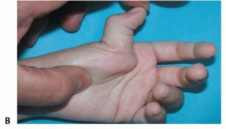 A supple thumb-in-palm posture is a normal finding in infants during the first year. Persistence of a tightly closed thumb in palm longer than 1 year is abnormal and should be evaluated.3The deformity is usually correctable at first and then progresses to a fixed deformity as myostatic contracture develops.A progressive and variable-size discrepancy of the involved limb may develop, resulting in a smaller thumb.1 The lack of thumb extension and abduction can impair hand grip, function, appearance, and hygiene.