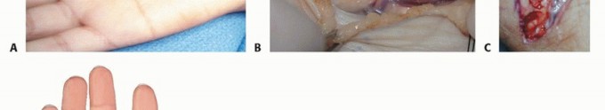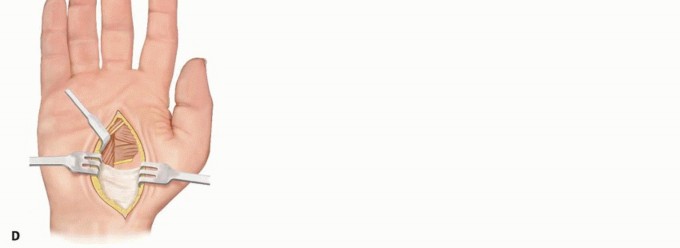 TECH FIG 1 • Intrinsic release. A. A curved incision is made over the thenar crease. B. Thenar release showing motor branch. C,D. Thumb intrinsics are released. The FPB origin at the transverse carpal ligament and trapezium may also be released if this muscle limits abduction and extension of the thumb ray.The first dorsal interosseous may be released at the distal portion of the muscle from the ulnar aspect of the first metacarpal if needed to obtain adequate passive abduction and extension of the thumb.
