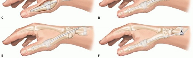 TECH FIG 4 • EPL rerouting. A. EPL tendon is divided distally and mobilized. B. The tendon is rerouted to the radial aspect of the Lister tubercle and passed subcutaneously around the APL and EPB tendon. C. The rerouted EPL is sutured back to the extensor mechanism. D. Modified EPL rerouting technique. The EPL tendon is divided proximal to the Lister tubercle, rerouted to the first extensor compartment, and sutured back to the proximal stump. E,F. EPL routing to the retinaculum. E. The EPL tendon is released from the third extensor compartment and rerouted radially. F. The new pulley for the rerouted EPL is created from the extensor retinaculum. The thumb is set in appropriate abduction and IP extension. The rerouted EPL is sutured back to the extensor mechanism 10 mm distal to the defect.The rerouted EPL may be reinforced by the transfer of the PL, FCR, or brachioradialis.The EPL may be divided proximal to the Lister tubercle, leaving the tendon attached to its insertion. Rerouting is then performed from distal to proximal (TECH FIG 4D).10The EPL may be rerouted to the new pulley created from the extensor retinaculum (TECH FIG 4E,F).12. Stabilization of Thumb Metacarpophalangeal Joint