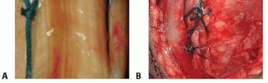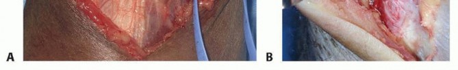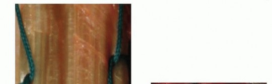 TECH FIG 6 • A,B. A running locking stitch is used to improve triceps purchase when reattaching the muscle to the ulna. A. An example of a running locking stitch on either side of the split tendon. B. A locking stitch that locks both sides of the split together with one continuous locking suture. It is then reinforced with a reversed across-split locking suture.(continued)
