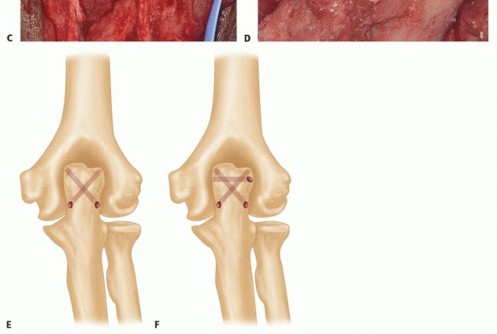TECH FIG 6 •(continued)C,D. The triceps footprint to which reattachment should be attempted is predominantly on the flat part of the ulna or olecranon process, and not the tip, which is resected to prevent posterior abutment. E. Drill holes (1.5 to 2 mm) are oriented in a crossing fashion to secure the triceps to the footprint area. F. A separate cinch suture is used to increase the security and the area of contact between the triceps and the ulna, thereby improving healing potential.