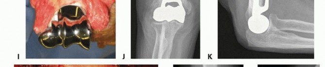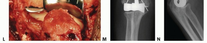 TECH FIG 4 •(continued)I-K. Latitude DHH. I. Intact medial and lateral humeral columns, with a red vessel loop loosely around the ulna nerve. J. AP radiograph demonstrating the trochlea and capitellum correctly sized for the host, greater sigmoid notch of the ulna, and the radial head. K. Lateral radiograph demonstrating a well-aligned radio capitellar joint and osseous integration of the anterior flange. L-N. Sorbie DHH. L. Fractured medial and lateral columns were reconstructed with K-wires, prior to implant insertion. M. AP radiograph demonstrating a well-seated Sorbie implant with healed medial and lateral columns. N. Lateral radiograph demonstrating a well-aligned radiocapitellar joint with posterior heterotopic ossification in the traumatically injured triceps muscle.