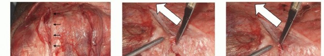 TECH FIG 3 • A. The triceps is split through its central tendon in line with the fibers. The tendinous portion is dissected from the olecranon to gain access to the ulna. B,C. To dissect the Sharpey fibers off the ulna, the surgeon uses the scalpel parallel to the ulna surface and maintains the release directly adjacent to the bone.(continued)