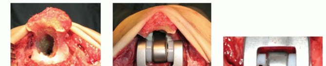 TECH FIG 4 • A. The humeral component entry point, the apex of the olecranon fossa, is identified, and humeral canal preparation is commenced by opening the canal with a bone nibbler or burr.(continued)