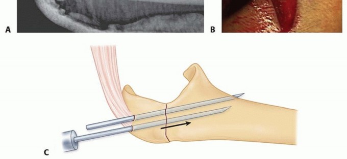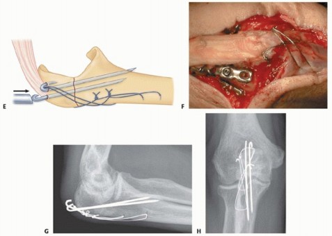 TECH FIG 1 • A. A lateral radiograph with the arm in plaster shows a transverse, noncomminuted fracture of the olecranon. B. An open reduction is held with a fracture reduction forceps. C. Two 1-mm Kirschner wires are drilled obliquely across the fracture site so that they exit the anterior ulnar cortex distal to the coronoid process. (A,B: Copyright , MD.)