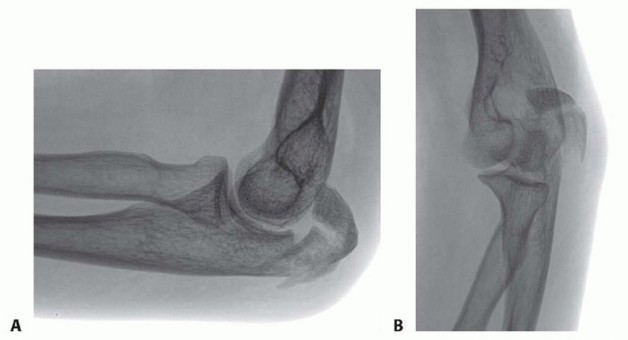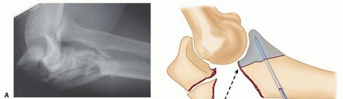 In contrast, undertreated or poorly treated fracture-dislocations of the olecranon often lead to severe arthrosis and angulation of the arm under the influence of gravity.Even well-treated complex injuries are at risk for stiffness, heterotopic ossification, arthrosis, and occasionally nonunion.