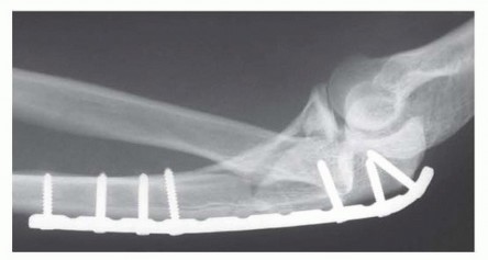 The vast majority of olecranon fractures are displaced and merit operative treatment.Transverse, noncomminuted fractures not associated with fracture-dislocation are treated with tension band wiring. 4,8Comminuted fractures and fracture-dislocations are treated with dorsal contoured plate and screw fixation. 1,2,3The treatment of fracture-dislocations requires attention to the coronoid, radial head, and lateral collateral ligament. 2,9,10,11Fracture-dislocations of the forearm (anterolateral Monteggia injuries) is treated with anatomic realignment ofthe ulna and plate and screw fixation. 10 Inadequate radiocapitellar alignment suggests residual ulnar angulation.