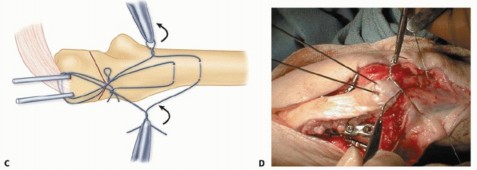 TECH FIG 2 • A. Two 22-gauge stainless steel tension wires are passed in a figure-of-eight fashion through drill holes in the ulnar shaft. B. They engage the triceps insertion proximally. C,D. The wires are