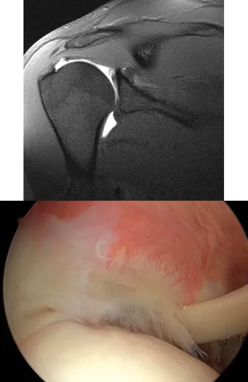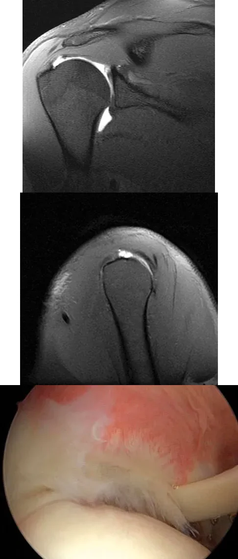 A 25-year-old man presents with right shoulder pain. MRI and arthroscopic images are provided. The pathology shown is best described as: