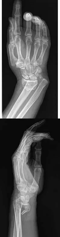 The radiograph and history are classic for primary degenerative arthritis of the elbow, characterized by osteophytes on the coronoid and olecranon, and loose bodies. Treatment consists of removal of loose bodies and impinging osteophytes along with capsular release. Total elbow arthroplasty is generally contraindicated in younger, active patients who wish to maintain heavy use of the extremity.