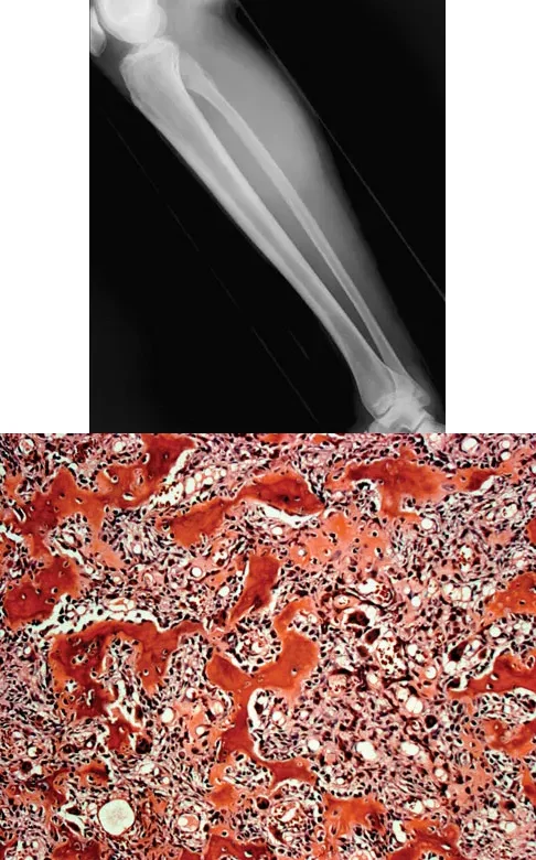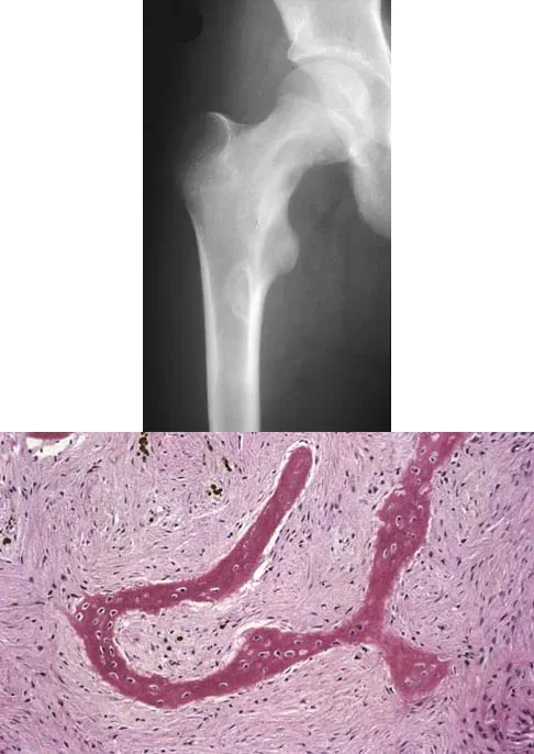 The clinical, radiographic, and histologic findings are classic for fibrous dysplasia. Radiographically, it presents as a lytic, expansile lesion with a 'ground-glass' matrix, often leading to bowing deformities in the proximal femur known as a 'Shepherd's crook' deformity. Histologically, it is characterized by a fibrous stroma containing irregular, woven bone trabeculae that lack osteoblastic rimming, often described as having a 'Chinese letter' or 'alphabet soup' appearance.