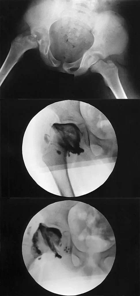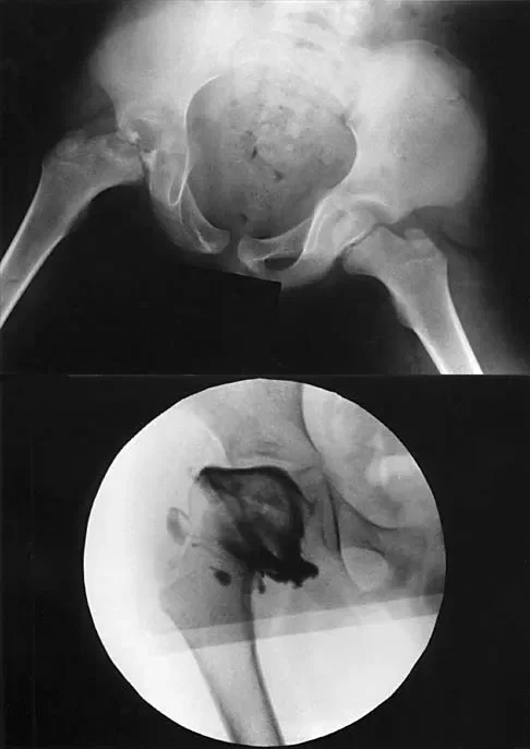 The radiographs demonstrate classic hinge abduction in a patient with Legg-Calve-Perthes disease. Hinge abduction occurs when the enlarged, deformed lateral portion of the femoral head impinges on the lateral acetabular margin during abduction, preventing the head from sliding concentrically into the acetabulum. The arthrogram shows medial dye pooling due to distraction of the joint. Persistent hinge abduction prevents proper femoral head remodeling and is an indication for surgical intervention.