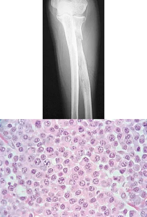A 65-year-old woman presents with chronic aching in her elbow. Radiographs and a biopsy specimen are shown. The histology reveals round to oval cells with an eccentric nucleus, prominent nucleolus, and a clear perinuclear area representing the Golgi apparatus. Which of the following is the most likely diagnosis?