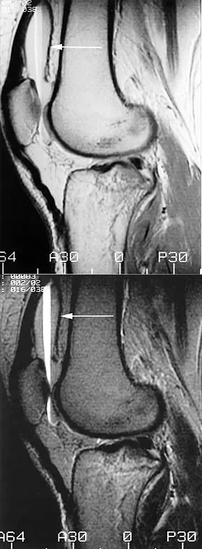 A 35-year-old skier sustains a twisting injury to the knee. An MRI is obtained, and a T1-weighted sagittal image is shown. The layering effect seen in the suprapatellar pouch is most strongly associated with which of the following underlying injuries?