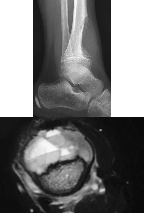 A patient presents with acute knee swelling following trauma. MRI scans (T1 and T2-weighted) are shown. The layering effect seen within the joint space is most strongly associated with which of the following underlying injuries?