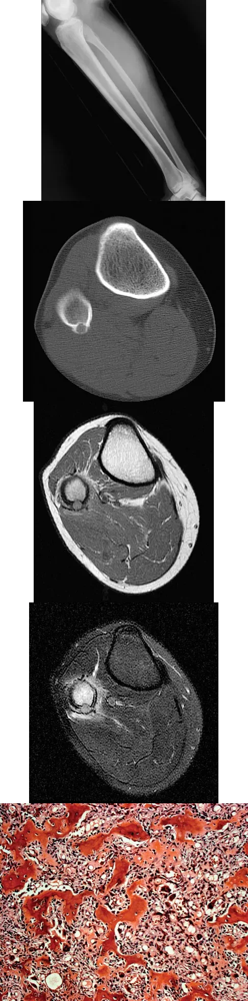 The clinical presentation, imaging (cortically based lytic lesion with surrounding edema), and histology are diagnostic of an osteoid osteoma. Histologically, it consists of a highly vascularized nidus of interlacing trabeculae of osteoid and woven bone lined by plump, benign osteoblasts.