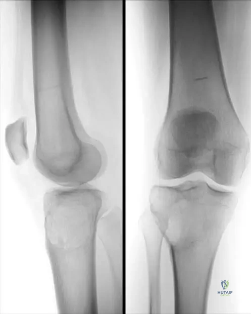 A 35-year-old female presents with knee pain. Plain radiographs of the proximal tibia are shown.