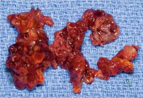 Rationale: As described in the clinical context for Fig. 8.55, grossly, giant cell tumors are composed of friable, brownish-red material. Main Distractor: White, cartilaginous material would be characteristic of a chondroid tumor, such as an enchondroma or chondrosarcoma.