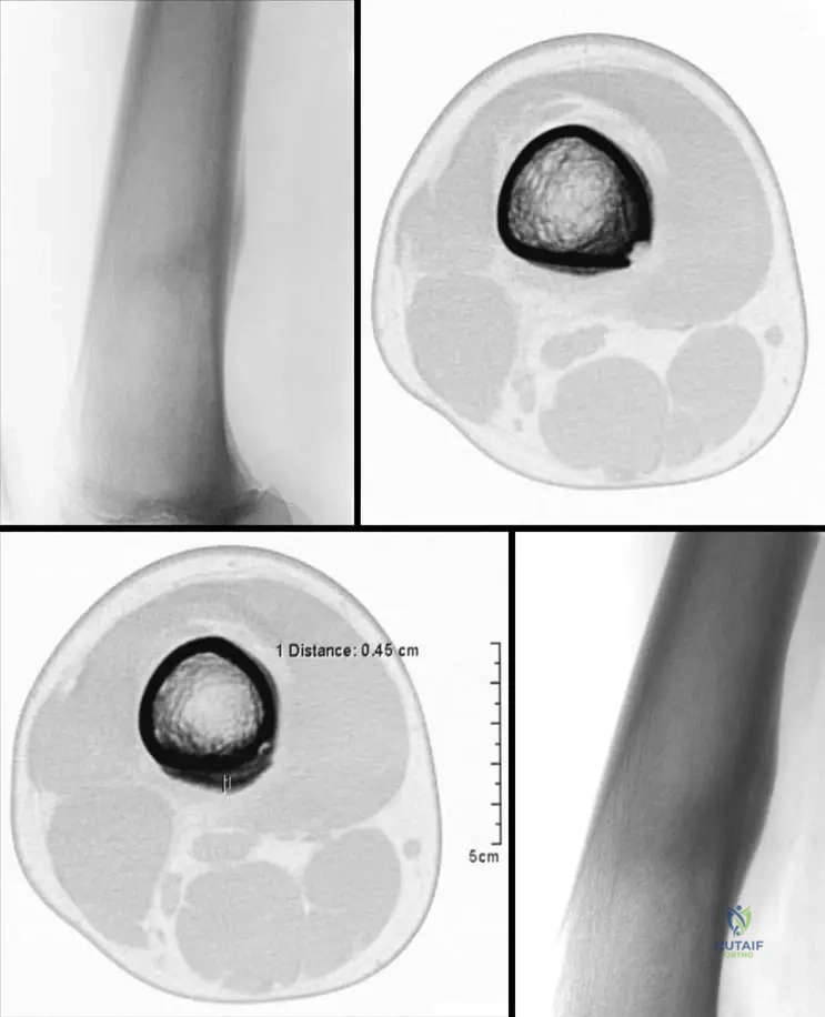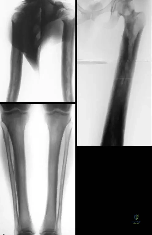 Rationale: The provided text describes the clinical features and radiographic findings but does not mention specific curative treatments or complex surgical interventions. Given the symptoms of limb pain and muscle weakness, symptomatic management, including pain relief and physical therapy to maintain muscle strength and mobility, would be the most appropriate general approach. There are no "special deformities" to surgically correct (A), bisphosphonates (B) are not mentioned as a treatment, bone marrow transplantation (D) is for hematological disorders, and prophylactic osteotomy (E) is not indicated as bone fragility or specific fracture risk is not highlighted.