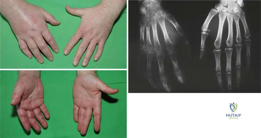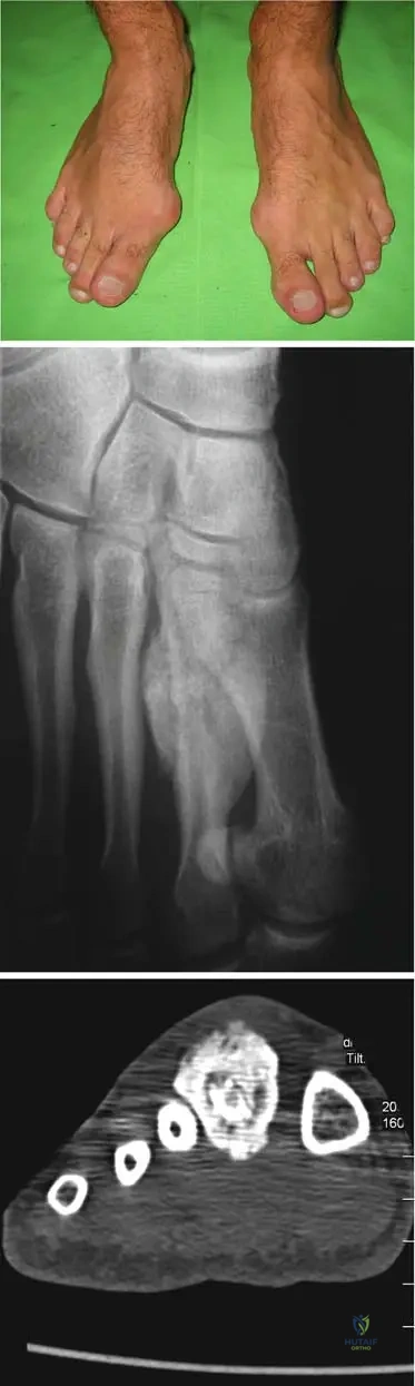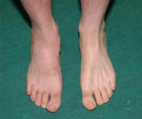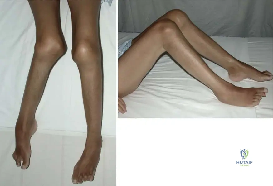 Rationale: The clinical context for Fig. 1.119 explicitly states: "No special deformities of the body are revealing for diaphyseal dysplasia." This means that while there are internal bone changes and a specific habitus, gross external deformities are not typically present or diagnostic. Options A, B, D, and E describe deformities that are not characteristic of Camurati–Engelmann disease as per the provided text.