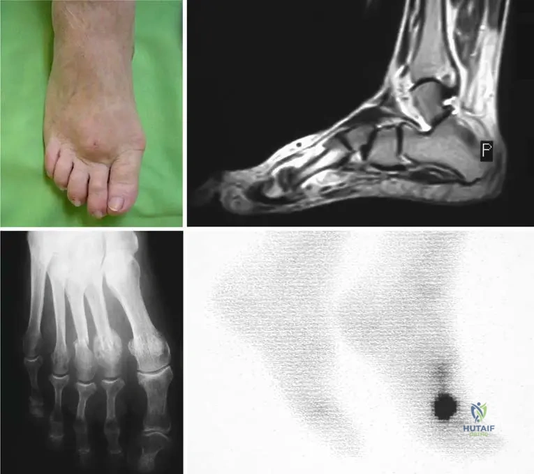 A 65-year-old female has a long-standing history of algodystrophy in her left foot, which initially presented with pain and swelling after a minor injury. Over several months, her symptoms have progressed.