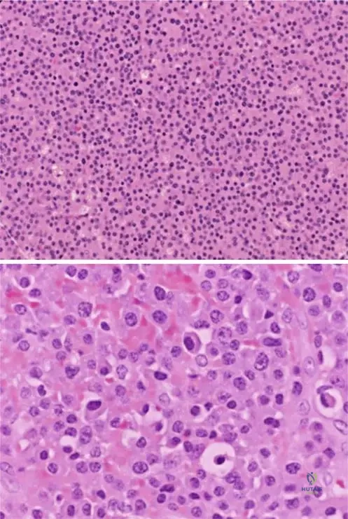 Rationale: Fig. 8.114 a, b's caption states, "Low power photomicrograph of myeloma (a). Lesions are hypercellular without matrix production." This directly describes the microscopic appearance. The other options contradict this specific histological description.