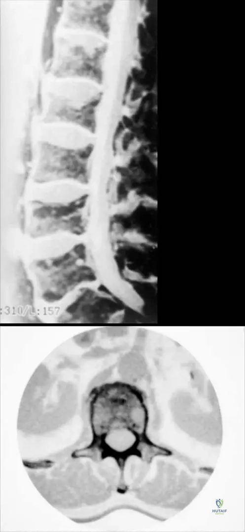 A 60-year-old male presents with chronic bone pain and fatigue. A complete blood count reveals anemia. What is the typical appearance of the bone involvement on imaging studies such as MRI and CT, as shown in the provided figures?