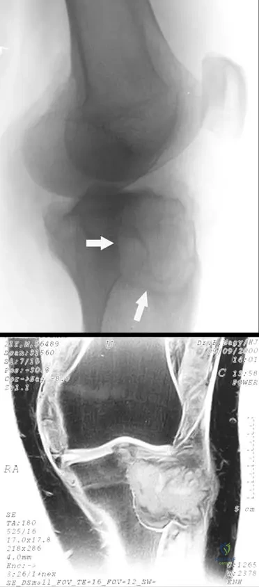 A 38-year-old male presents with chronic left knee pain and swelling. Initial radiographs are obtained.