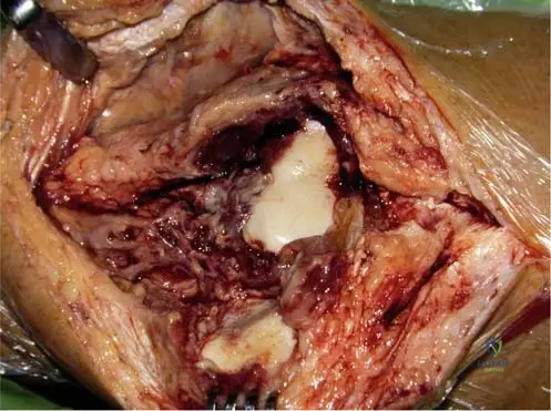 A 58-year-old female with rheumatoid arthritis presents with pain and swelling over the dorsal aspect of her wrist, accompanied by difficulty extending her fingers. An ultrasound confirms extensor tenosynovitis. Intraoperatively, hypertrophic synovial tissue is observed penetrating into the extensor tendons.