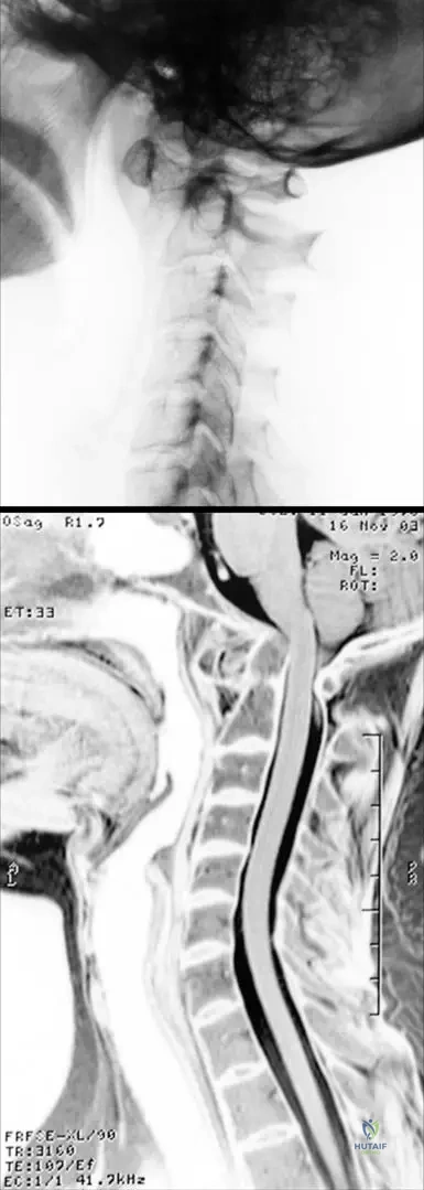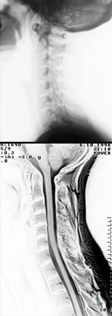 A 48-year-old female with early-stage rheumatoid arthritis reports mild neck stiffness. An X-ray and MRI of the cervical spine are performed. The images show incipient atlanto-axial synovitis with moderate subluxation, but the MRI confirms a normal liquor space around the spinal cord without cord involvement.