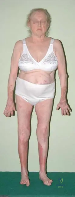 A 67-year-old female has been suffering from severe rheumatoid arthritis for 20 years and has been on long-term steroid treatment. On examination, she exhibits typical hand and foot deformities, and her face appears altered with features consistent with chronic steroid use.