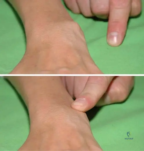 Rationale: The clinical description, "It can be reduced with moderate pressure, but as soon as the pressure is released it returns to the dislocated position," is precisely how the "piano-key" sign is described in the text (Fig. 3.5 b) in the context of dorsal dislocation of the ulnar head due to synovitis of the radioulnar joint. Main Distractor: Finkelstein's test is used to diagnose De Quervain's tenosynovitis, which involves pain at the radial styloid, not dorsal ulnar head instability.